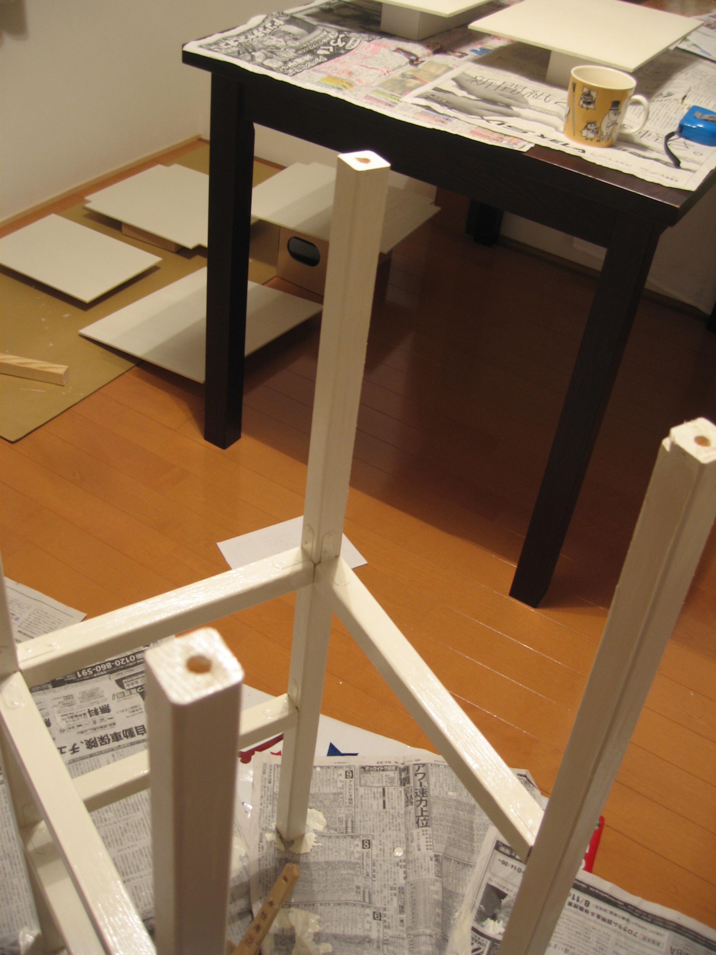 組み立てが終わる頃にはカナイが行っていたペンキ塗りも結構進んでいたので私も棒のペンキ塗り。